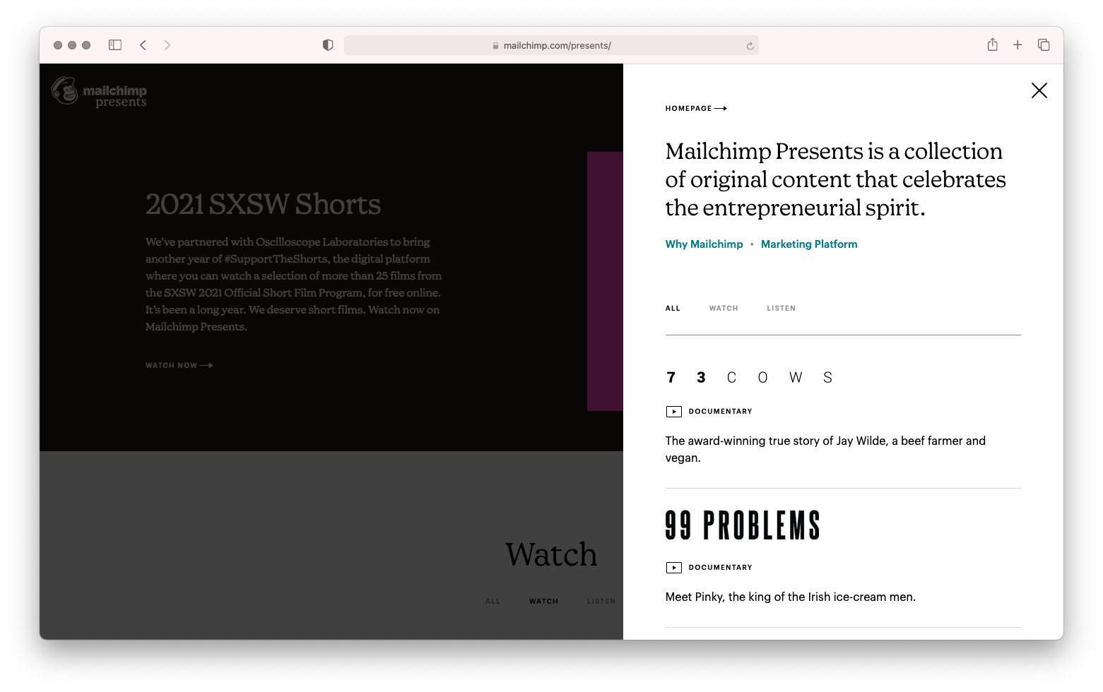 Mailchimp was moving away from their story about being an "email marketing service" and shifting to a larger narrative about supporting an entrepreneur's journey every step of the way. Now, they have a thriving ecosystem that produces award-winning podcasts and documentaries, covering stories about side-hustles to career transitions to mom-and-pop shops. Rather than relying on advertising — which they've done beautifully in the past with campaigns like MailShrimp and FailChips — they invested in a team that now creates at scale. No more outsourcing stories. No more dumping millions of dollars into campaigns that get talked about for a week at best. No more relying on traditional media to get their story right.