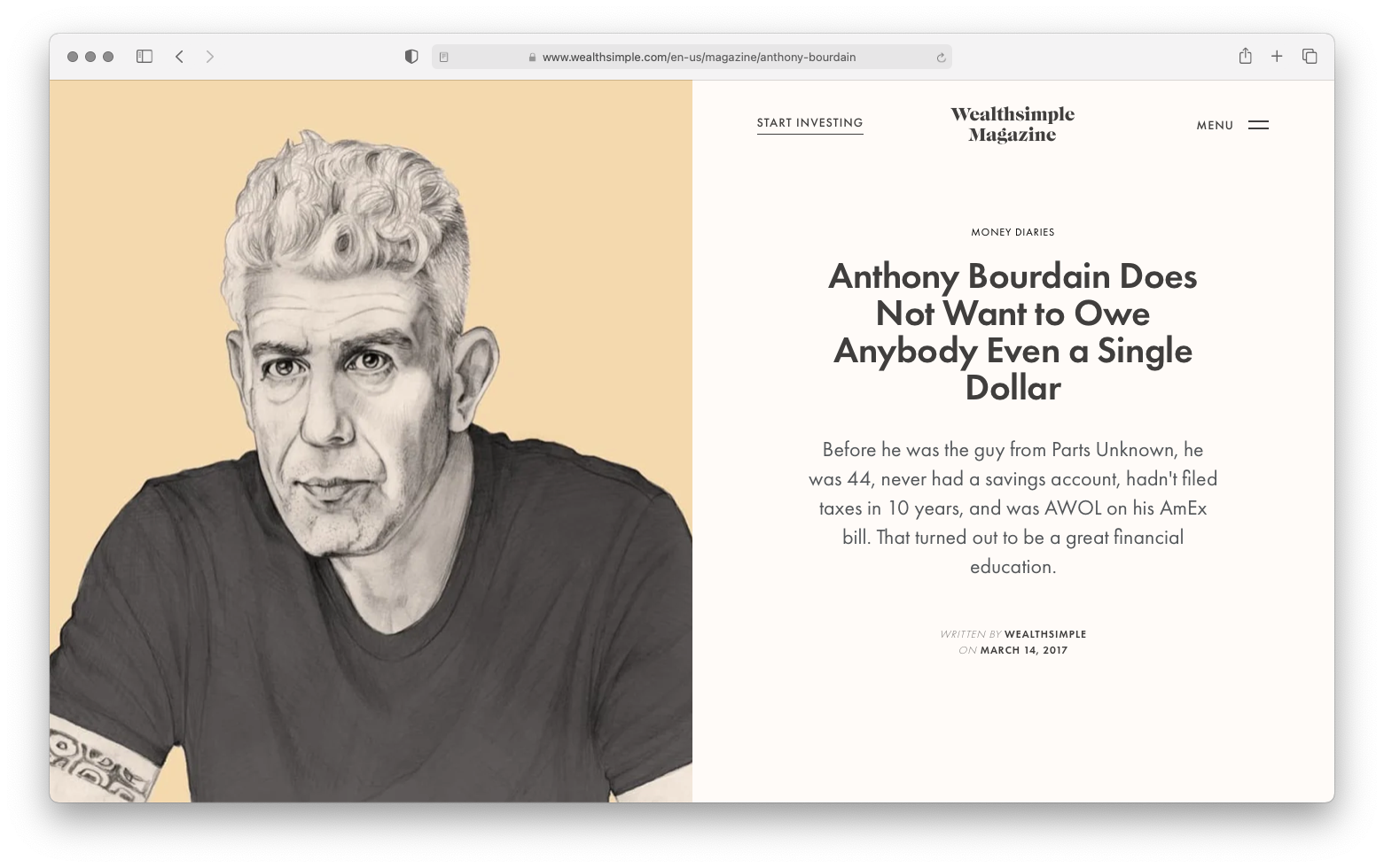 I stumbled upon an article on Wealthsimple about Anthony Bourdain — RIP, legend — about how he didn't have a savings account until his mid-forties. As a broke millennial, his words resonated with me. It didn't make me feel like a total failure; plus, I had never read something so personal about money from a celebrity. Wealthsimple, which does auto-investing wealth management, is the only company of this kind that has invested in an editorial platform. With smart writing, good design, and a strong point of view about the conversations they wanted to cover, I was immediately hooked. So, I signed up.