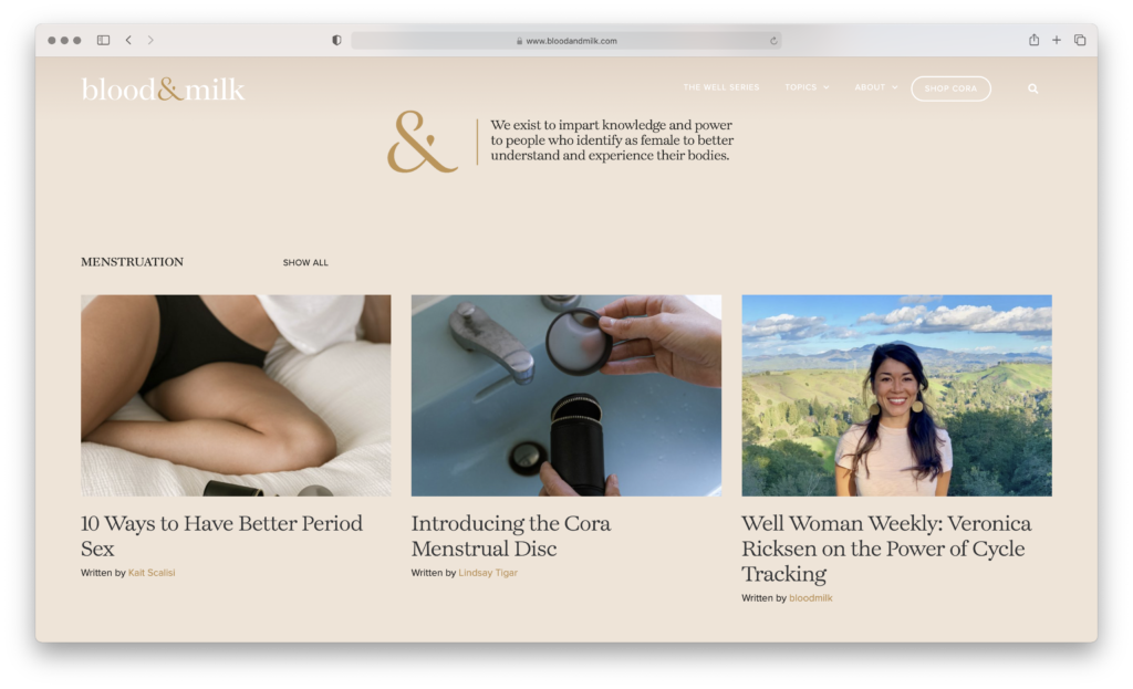 Cora, a rising star in feminine care, has a publication called Blood & Milk, where they write about “taboo” topics vulnerably and thoughtfully. A great product + a publication that expresses their values and beliefs, through a lens of generously uplifting and empowering women: This is how brands will create a competitive advantage vs. those who don’t build their own gardens.