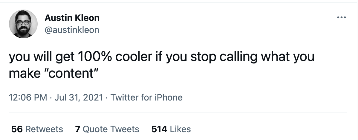 My friend Jocelyn K. Glei said the best bit about the problematic word “content” in an interview we did together in 2018 (emphasis mine):